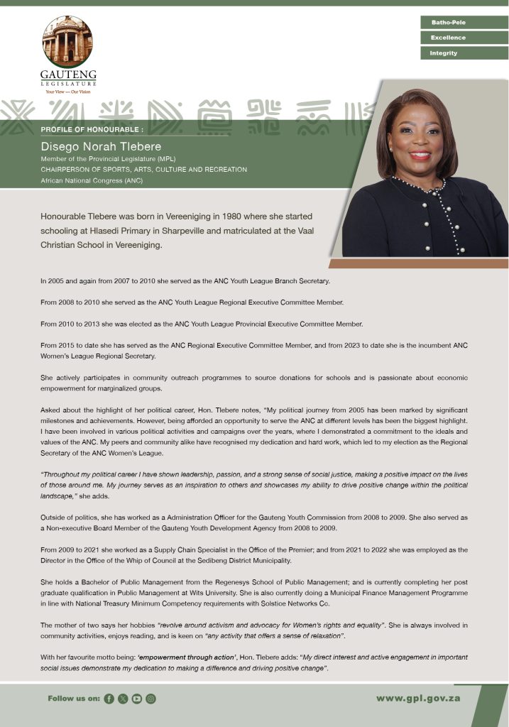 CHAIRPERSON OF SPORTS, ARTS, CULTURE AND RECREATION PORTFOLIO COMMITTEE