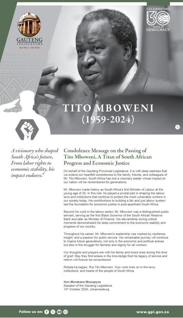 CONDOLENCE MESSAGE ON THE PASSING OF TITO MBOWENI